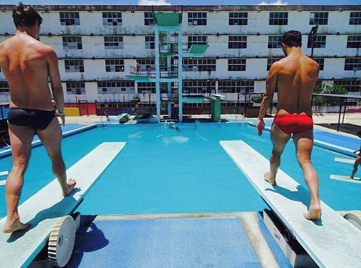British divers hang in a big topless group as Canadian ones (Philippe Gagné and François Imbeau Dulac) from behind whilst Jack Laugher gets wet whilst overdressed.